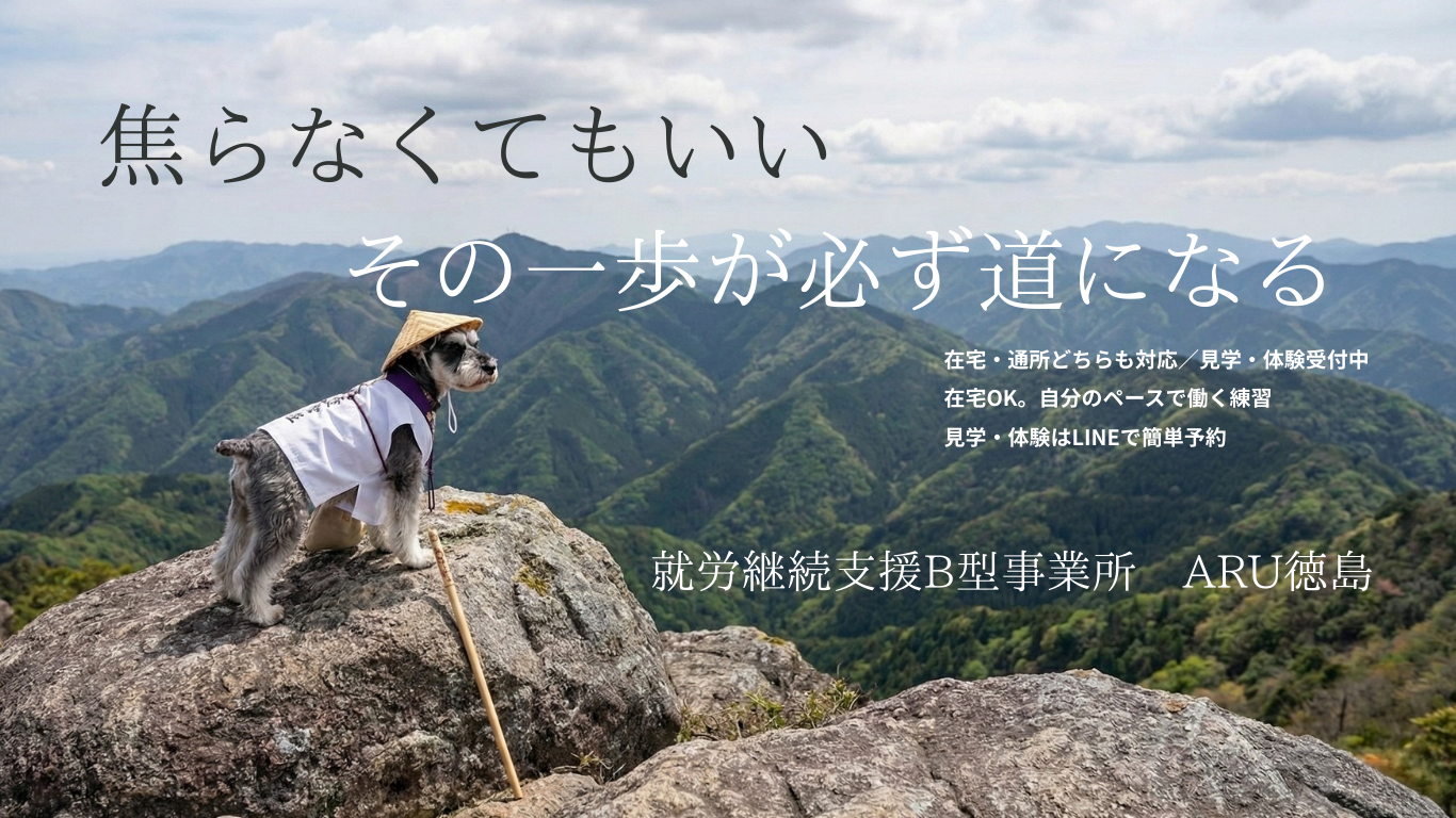 就労継続支援B型事業所 ARU徳島は、通所・在宅の両方に対応し、体調や特性に合わせて「続けられる働き方」を一緒に設計します。作業は段階的に慣れていけるように調整し、日々の困りごとや不安も支援員が伴走します。まずは見学・体験からで構いません。お気軽にお問い合わせください。