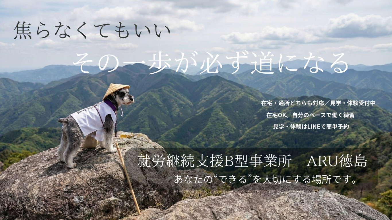 就労継続支援B型事業所 ARU徳島は、通所・在宅の両方に対応し、体調や特性に合わせて「続けられる働き方」を一緒に設計します。作業は段階的に慣れていけるように調整し、日々の困りごとや不安も支援員が伴走します。まずは見学・体験からで構いません。お気軽にお問い合わせください。
